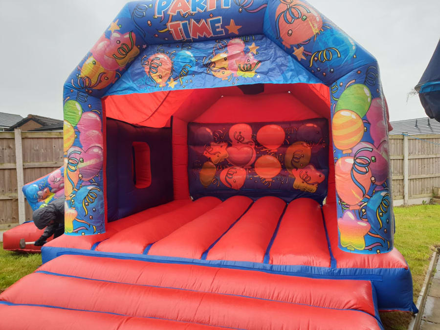 Our bouncy castle hire Red Blue Party Time Bouncy Castle With Side Slide in Liverpool, Widnes, Runcorn, St Helens, West Derby, Huyton, Kirkby, Knowsley Village, Dovecot, Page Moss, Knotty Ash, and Old Swan is designed to bring joy and laughter to your little ones. With reliable delivery and setup services, you can rest assured your party entertainment is in safe hands with us.