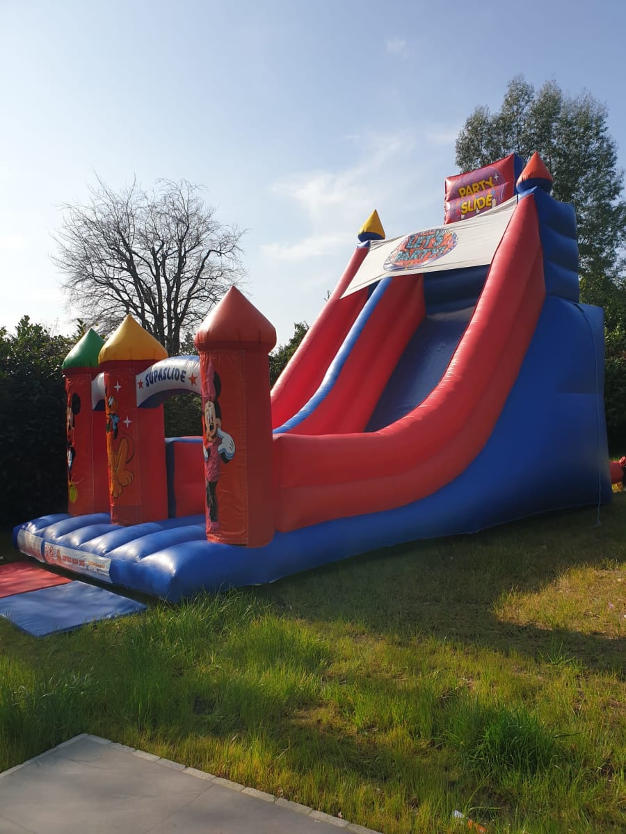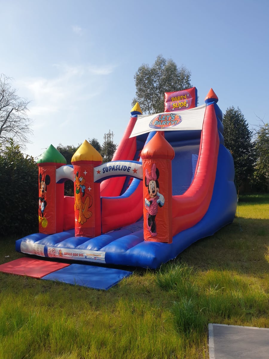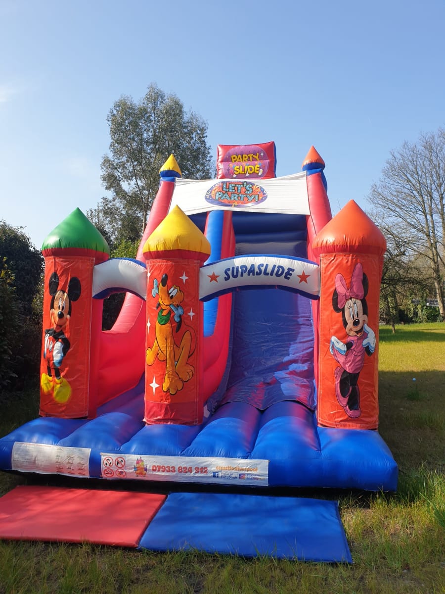 Bring an extra dash of enchantment to your next event with our Mickey And Minnie Mouse Mega Slide. This charming inflatable slide is a perfect attraction for both children and adults, making it an ideal centrepiece for family gatherings, BBQ parties, holiday celebrations, or any fun-filled occasion. With its impressive dimensions of 15ft wide and 27ft long!, it promises endless entertainment and joy for all ages. Why not make it a complete package and add our Mickey mouse club house bouncy castle with this slide.
